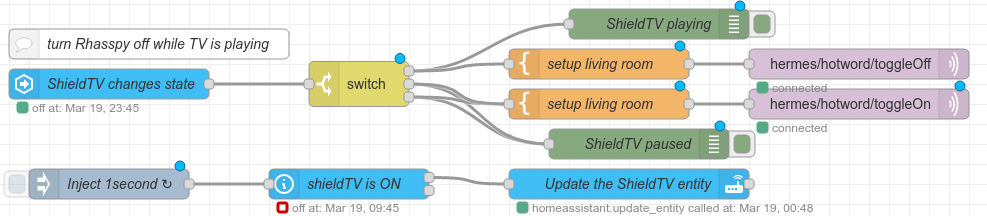 It starts with an inject, which repeats at 1 second interval. If the state of my shield_tv is not “off”, it calls home assistant’s update_entity service to update the media_player.shield_tv